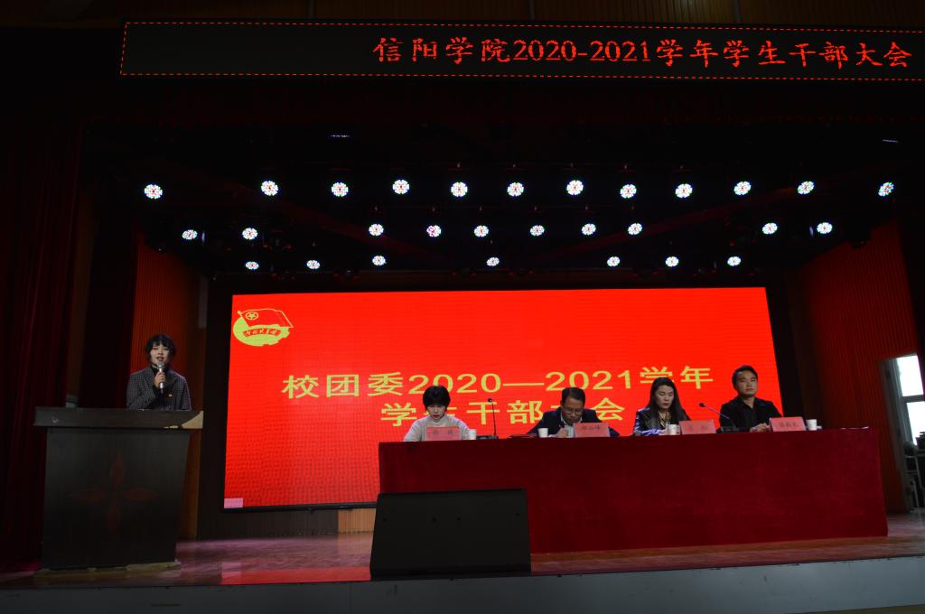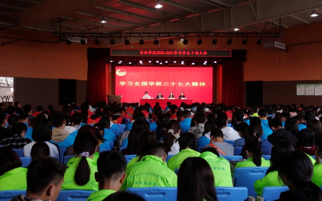10月23日中午,校团委在大学生活动中心召开2020—2021学年学生干部大会,学习全国学联二十七大会议精神,表彰优秀学生干部,任命新一届学生组织负责人。校团委全体教师出席大会。校学生会、社团联合会、志愿者服务中心、大学生艺术团、礼仪队、团委助理、青年媒体中心以及青年志愿者协会负责人和大一学生代表参加了会议。王红老师主持大会。