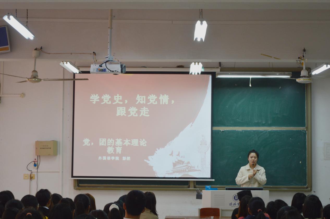 为了深入学习贯彻习近平新时代中国特色社会主义思想和党的十九大精神,团的十八大精神,深刻领会习近平总书记对广大青年的寄语精神,外国语学院于11月2日中午,在外语楼302教室举行了“学党史,知党情,跟党走”--党和团的基本理论教育专题团课。院团总支书记彭然担任主讲人,2020级新生代表聆听了本次团课。