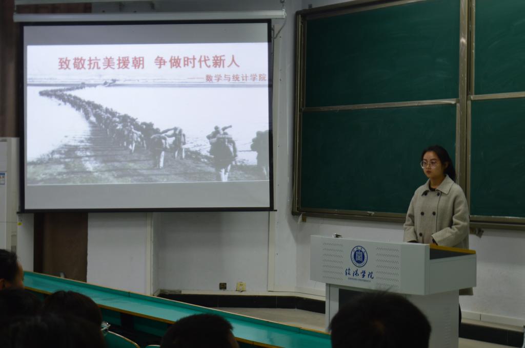 为传承红色基因,缅怀战斗英雄,数学与统计学院于10月30日下午在数计楼105教室开展了以“致敬抗美援朝,争做时代新人”为主题的团日活动。学工干事田媛、团总支书记白智然、全体共青团员参加会议,会议由白智然主持。