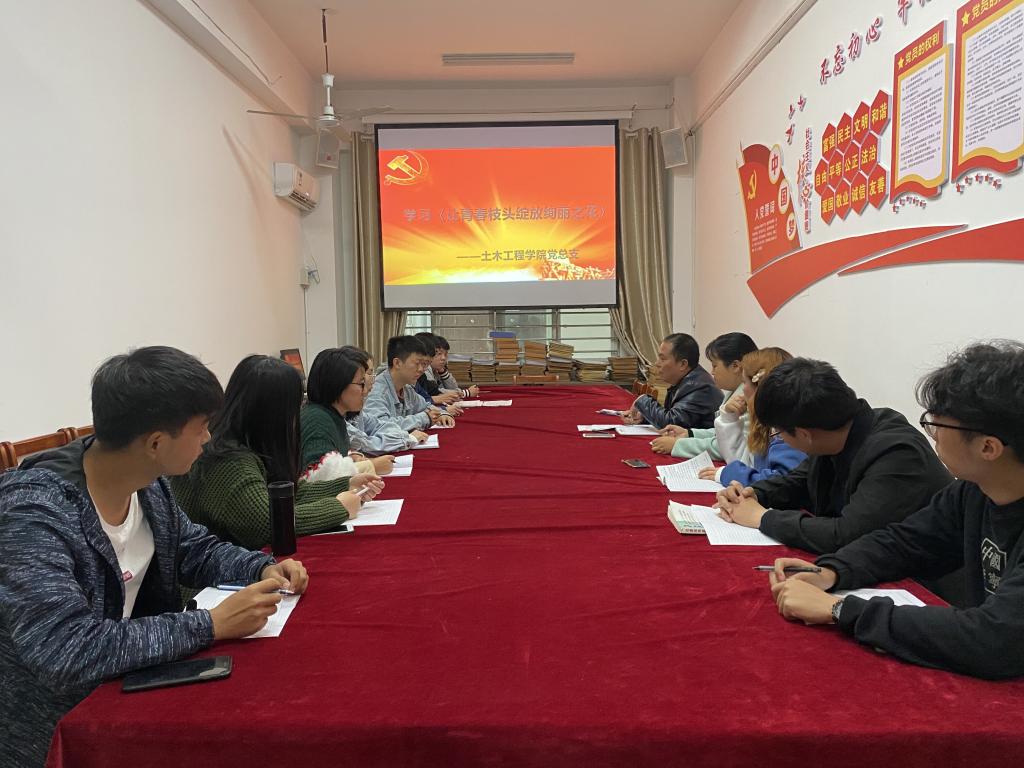 土木工程学院于11月6日在理工楼112会议室召开了“让青春枝头绽放绚丽之花”的学习交流会。土木工程学院党总支书记兼副院长潘卫国,学生支部书记唐辉、吴琼茹及2020年下半年全体党员发展对象参加了此次交流会。