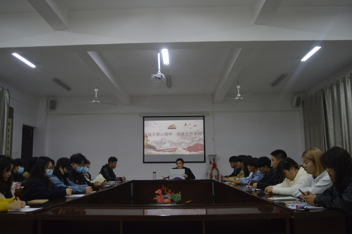 袁军从2019年9月16日习近平总书记来到信阳市新县的鄂豫皖苏区首府革命博物馆,会见当地红军后代、革命烈士家属代表讲话为切入口,铭记习近平总书记:“吃水不忘掘井人,要把先辈们的英雄故事讲给大家听,讲给年青一代听”殷殷嘱托。向同学们阐述了为什么要传承红色基因?传承哪些红色基因?如何传承好红色基因?并详细讲述了大别山革命历史和大别山精神的由来和内涵。大别山是仅次于中央苏区的第二大的革命根据地,是中国革命武装斗争的重要发源地之一,诞生了多支红军主力,创造了“28年红旗不倒”的奇迹。解放战争时期,这里是刘邓大军千里跃进大别山的落脚地,为中国革命胜利作出了不可磨灭的贡献。在残酷的斗争中,大别山区的军民同心同德,浴血奋战,前仆后继,谱写了一曲曲气壮山河的动人诗篇,创造了大别山辉煌的历史。在漫长的革命岁月中,老区人军民铸就了以“坚守信念,胸怀全局,团结奋斗,勇当先锋”为主要内涵的大别山精神。
