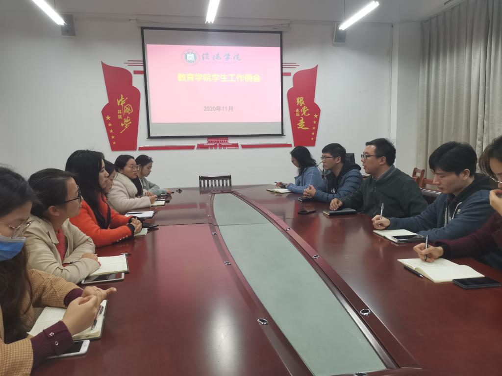 2020年11月18日上午,教育学院在社科楼107会议室召开学生工作例会,本次参会人员有教育学院党总支书记张甲楠、学工干事郝昊和全体辅导员,会议由郝昊主持。