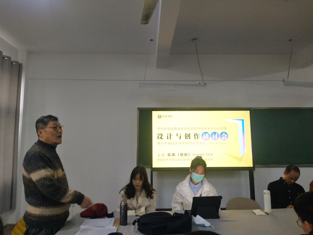 张森教授在中国美术家协会一直担任重要职务。此次学术汇报活动,张森首先以国家级美术专业组织的视野对插图与书籍装帧的概念与形式进行了详细的讲述与分析,尤其是在插图创作的媒介多元化等方面进行了深入的探讨。其次,张森教授与大家分享了中国美术家协会插图装帧艺委会在2021年度所拟定、筹备的几项大展并进一步组织动员我院教师与学生做好赛前准备工作。最后,张教授以自己的艺术创作与设计作品为例,与大家进行了较为详实、深刻的交流。