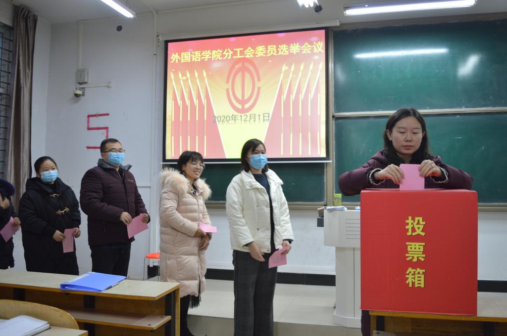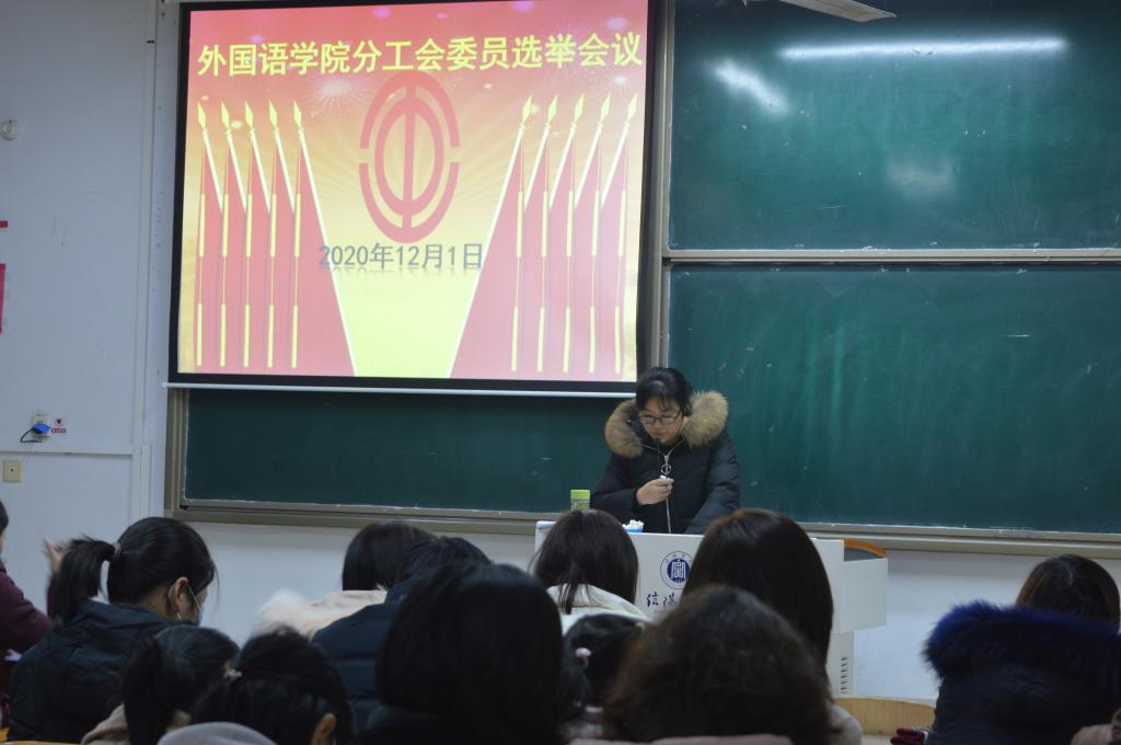 12月1日下午,外国语学院在外语楼202教室召开外国语学院分工会委员补选会议及分工会主席选举会议,全体工会会员参会。会议由分工会委员梁书荣主持。