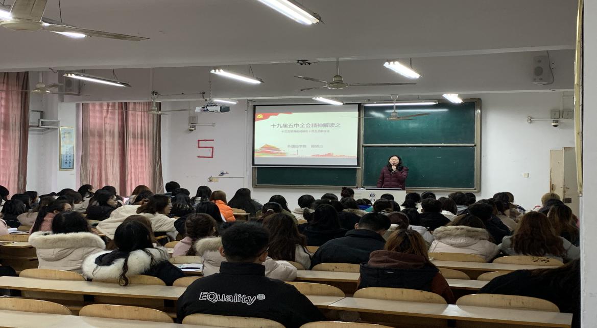 12月2日中午,外国语学院在外语楼202教室,举行第九期入党积极分子党课专题报告会,由党总支副书记程娇炎主讲,带领全体积极分子认真学习领会了十九届五中全会精神,重点解读了十三五取得的成绩和十四五的新提法。