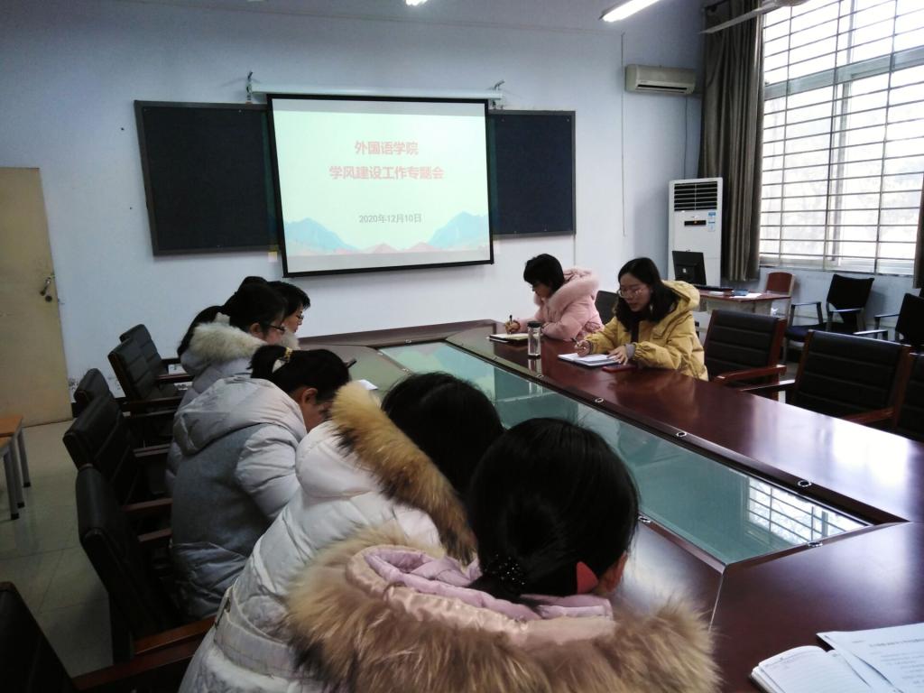 12月10日上午,外国语学院在外语楼110会议室召开学风建设工作专题会议。学院党总支副书记程娇炎、学工干事刘阳红及全体辅导员参加了本次会议。