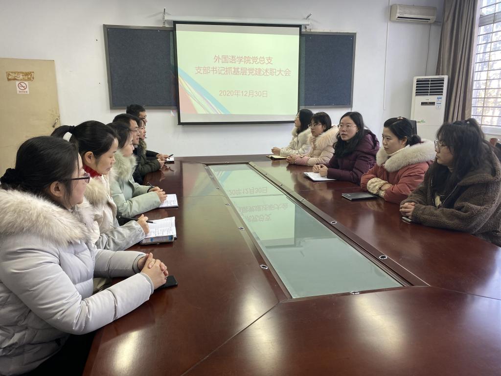 12月30日下午,外国语学院党总支在外语楼110会议室召开各支部书记抓基层党建述职大会,全体党支部书记参加了会议,会议由党总支副书记程娇炎主持。