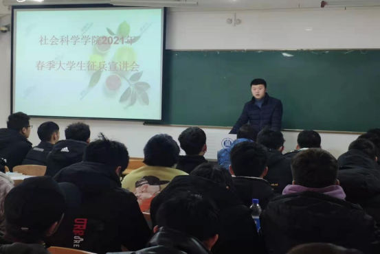为响应国家号召,鼓励在校大学生积极参军入伍,进一步提兵源高量,推进国防和军队现代化建设,社会科学学院于2020年12月31日下午,在社科316教室举行了2021年春季大学生征兵宣讲活动。社会科学学院学工干事陈苗苗、团总支书记曹惠、辅导员刘雪、陈功林、薛珊珊等老师,学院部分男生参加了此次活动。