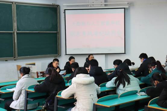 为加强考风考纪教育,强化学生诚信意识,大数据与人工智能学院于12月30日下午召开期末考风考纪教育动员会,党总支副书记毛凤翔、学工干事李进、辅导员、各班级班长和学委参加此次会议。此次会议由李进主持。