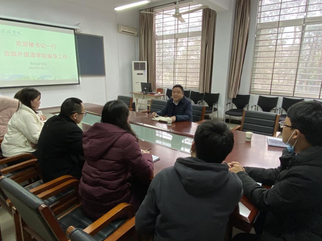 近日,校党委书记褚金海、校长办公秘书室秦笠一行到外国语学院调研指导工作。院长罗德喜、党总支副书记程娇炎、教学副院长李静、行政干事梁书荣、学工干事刘阳红、教学干事李达和全体辅导员老师参加此次座谈。