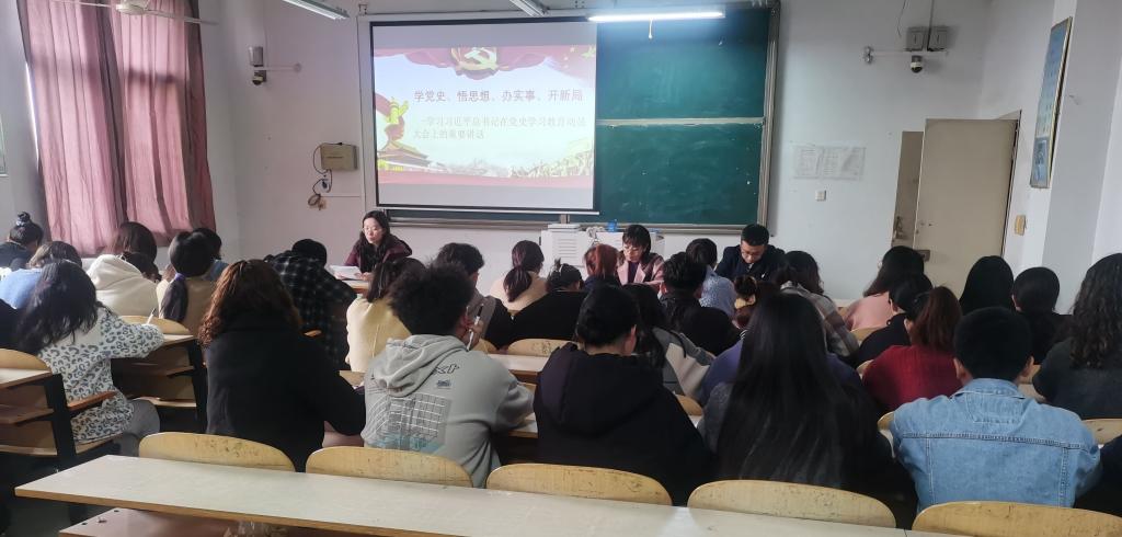 程娇炎以《学党史、悟思想、办实事、开新局》学习习近平总书记在党史学习教育动员大会上的重要讲话为主题,她带领同学学习了习近平总书记的重要讲话,强调全党同志要做到学史明理、学史增信、学史崇德、学史力行,学党史、悟思想、办实事、开新局,增强“四个意识”、坚定“四个自信”、做到“两个维护”,以优异成绩迎接建党一百周年。另一方面,站在“两个一百年”奋斗目标历史交汇的关键节点,作为外语专业的学生,要勇于做连接东西方文化的桥梁,承担传播中国传统文化的使命。最后鼓励同学要认真学习党的历史,不忘初心,牢记使命,将所学、所悟、所得与实际工作和学习相结合,作出自己应有的贡献。