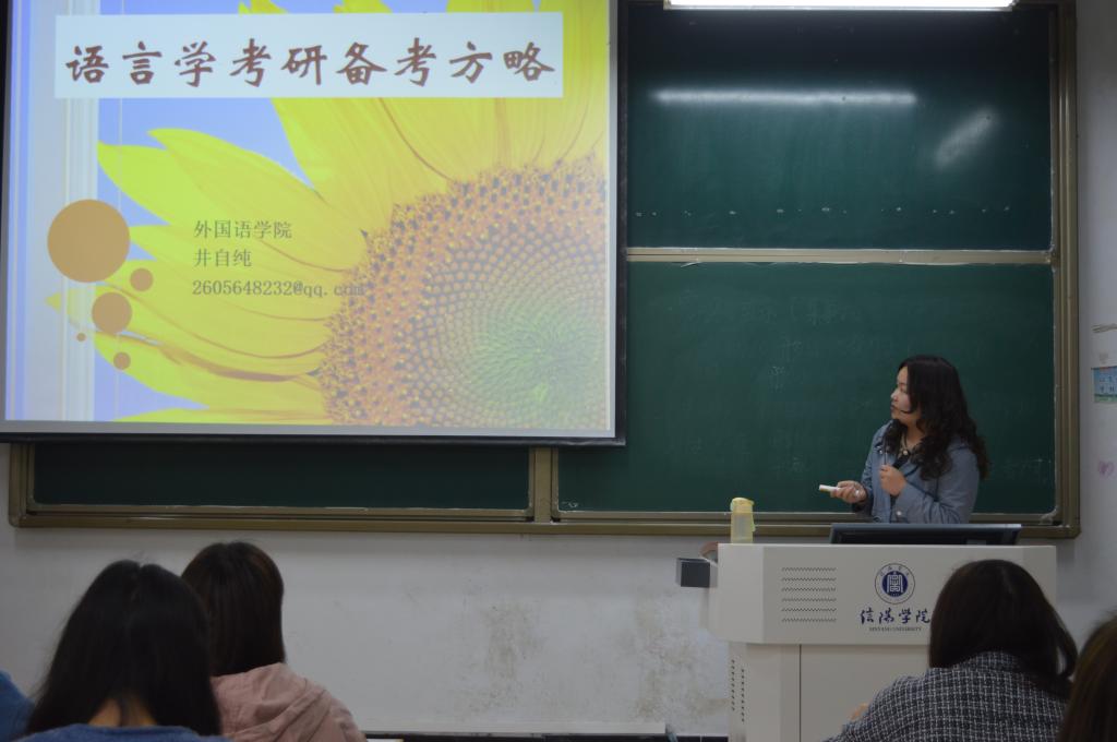 为了给有意向考研学生们提供更多的考研经验,3月30日下午,外国语学院在外语楼405教室举行了考研系列讲座之“语言学考研备考方略”。外国语学院党总支副书记程娇炎、学工干事刘阳红、部分辅导员老师和2018级学生参加了本次讲座,本次讲座由井自纯老师主讲。