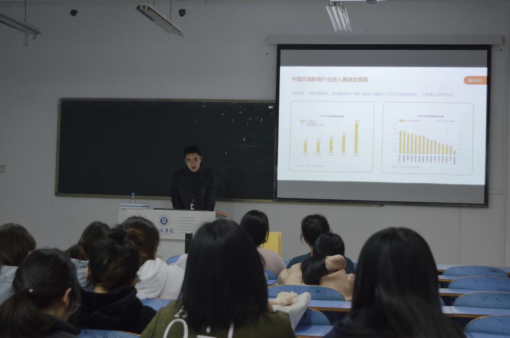 教育机构负责人通过视频和PPT的形式向同学们展示了教育机构的办公环境,分别向同学们介绍了招聘岗位、岗位职责、招聘的要求、薪资待遇、福利以及员工的保障等,分析了工作发展的未来前景和趋势。宣讲会上,同学们主动提问,积极互动,宣讲效果良好。