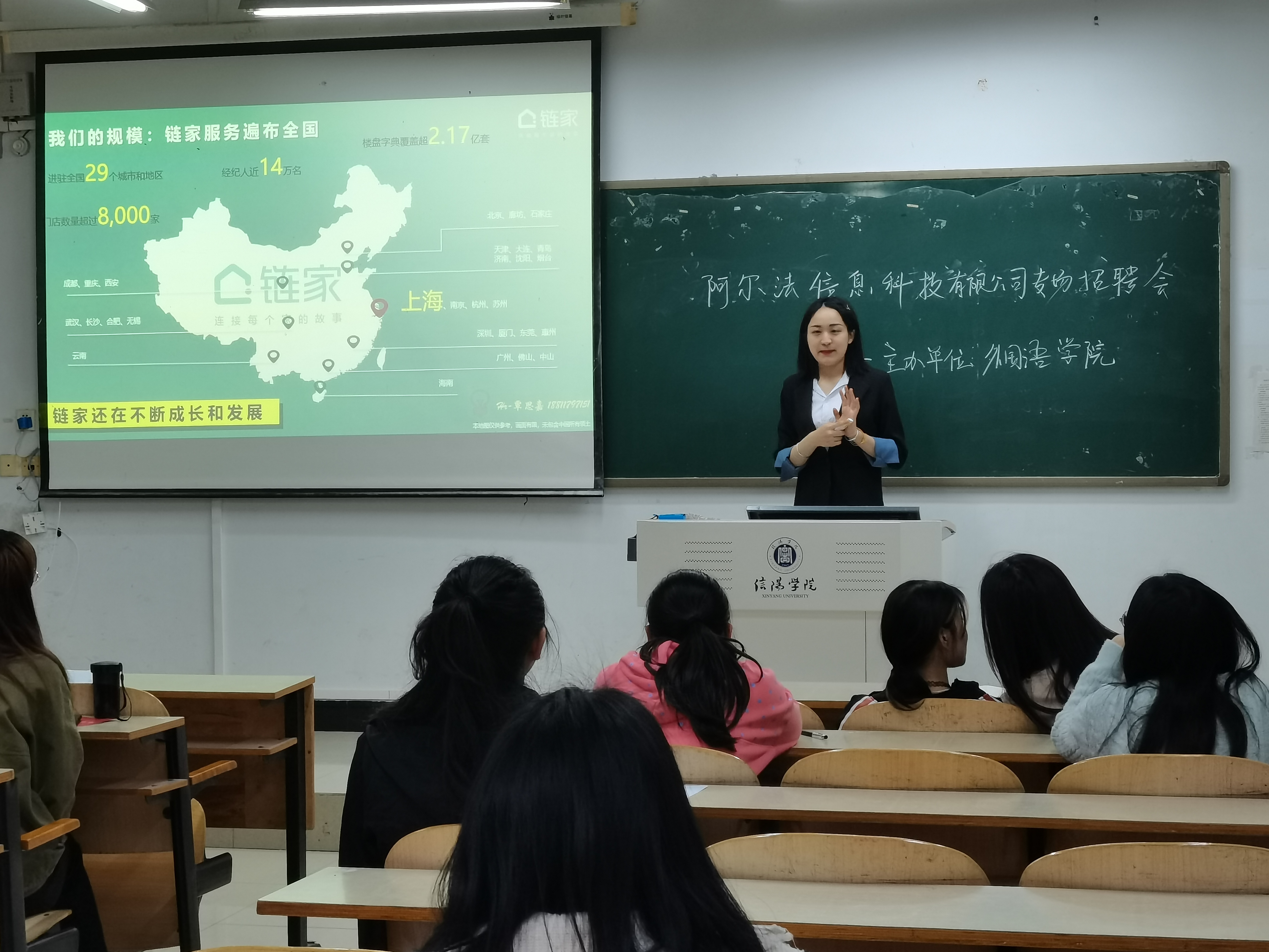招聘会上,美吉姆(驻马店)教育集团,阿尔法信息科技有限公司和北京链家负责人分别听过PPT介绍了各自集团的基本情况,工作环境、招聘要求、开设课程、集团福利、薪资待遇、评估体系以及如何晋升等,学生也对自己关心的问题进行了提问,招聘单位进行了一一解答。