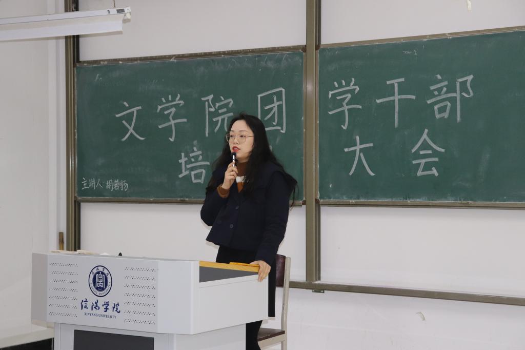 4月25日上午,我院在人文楼310召开文学院团学干部、学生会全体工作人员培训活动。文学院学生会全体成员参加此次活动,活动由团总支书记胡若扬主持。