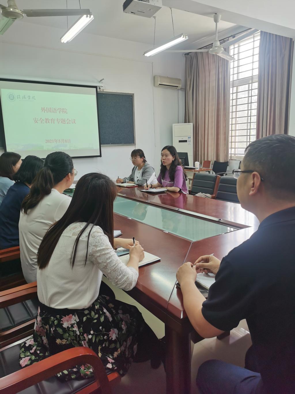 5月8日下午,外国语学院在外语楼110会议室召开安全教育专题会议,外国语学院党总支副书记程娇炎、学工干事刘阳红以及全体辅导员参加会议。