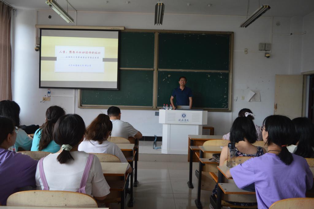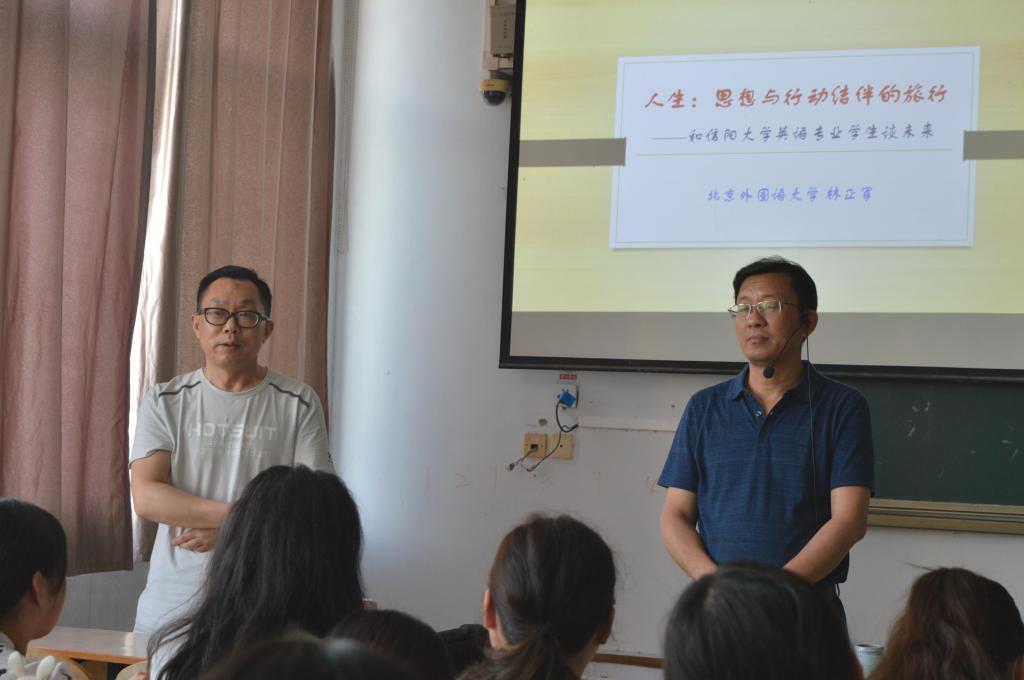 5月31日下午,外国语学院在外语楼304教室举行“人生:思想与行动结伴的旅行--和信阳大学英语专业学生谈未来”专题学术讲座,外国语学院院长罗德喜、学工干事刘阳红以及2018级学生参加了此次讲座。本次讲座由北京外国语大学博士生导师林正军教授主讲,外国语学院院长罗德喜主持。