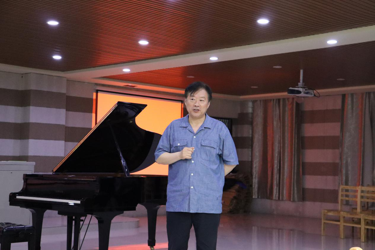 音乐会结束后,王凯歌院长对音乐会进行了总结讲话:我们要大力提倡老师学生开展各式各样的音乐会,我们学生学习的知识,提高的能力要有平台去实践,要结合实践才可以让学生更好的成长。学习音乐就像学习做人,立德树人,立乐树音。指导老师引导思路新颖独特,以“音,诗,画”结合,用三维一体的方式进行艺术的表达,融合了艺术的多元性,提高了大家的审美,是美育的重要途径,对于学生是非常好的艺术熏陶,也是实践教学的体现。讲话结束后王凯歌院长和全体老师与演出人员进行了合照留念。