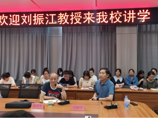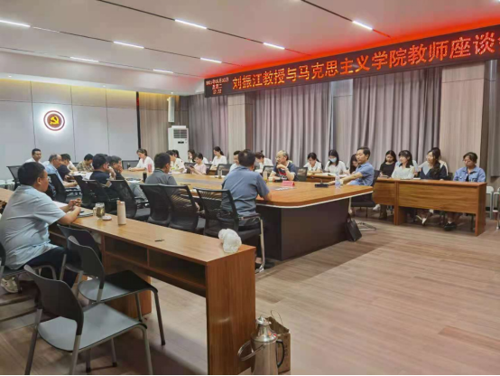 报告会结束后,刘振江与马克思主义学院全体教师进行了座谈。王凤山教授就党史研究,郭世杰副教授、李达理博士就高校科研、青年教师成长等方面和刘教授进行了深入的探讨与交流。