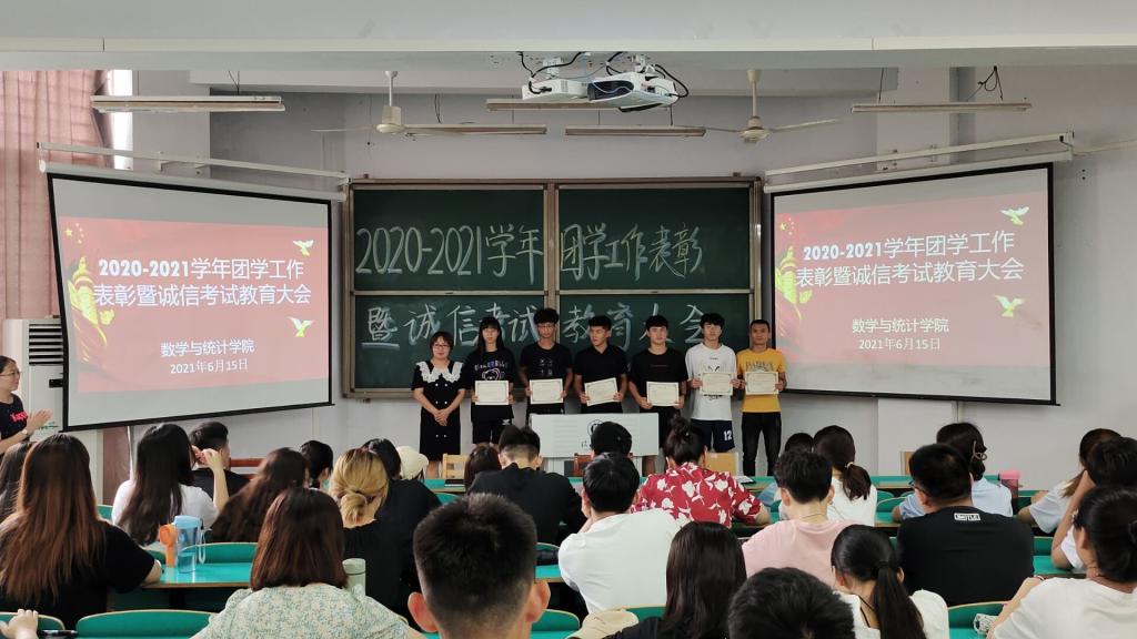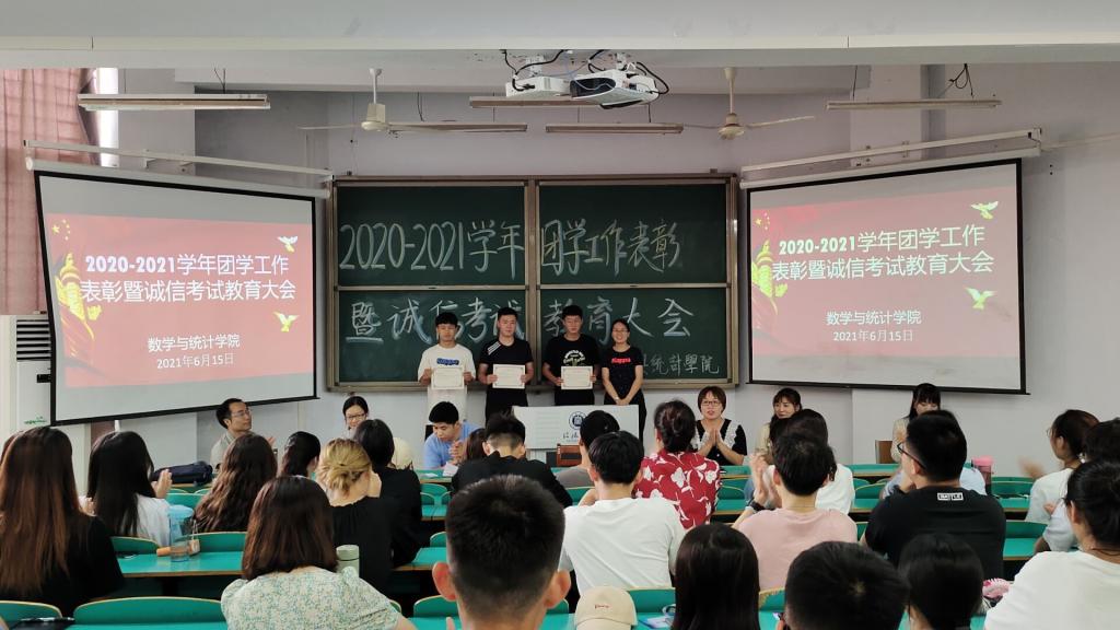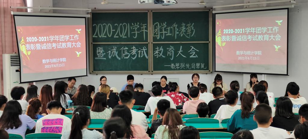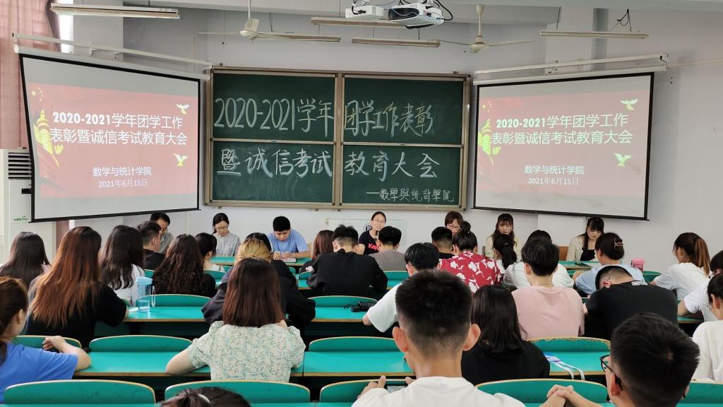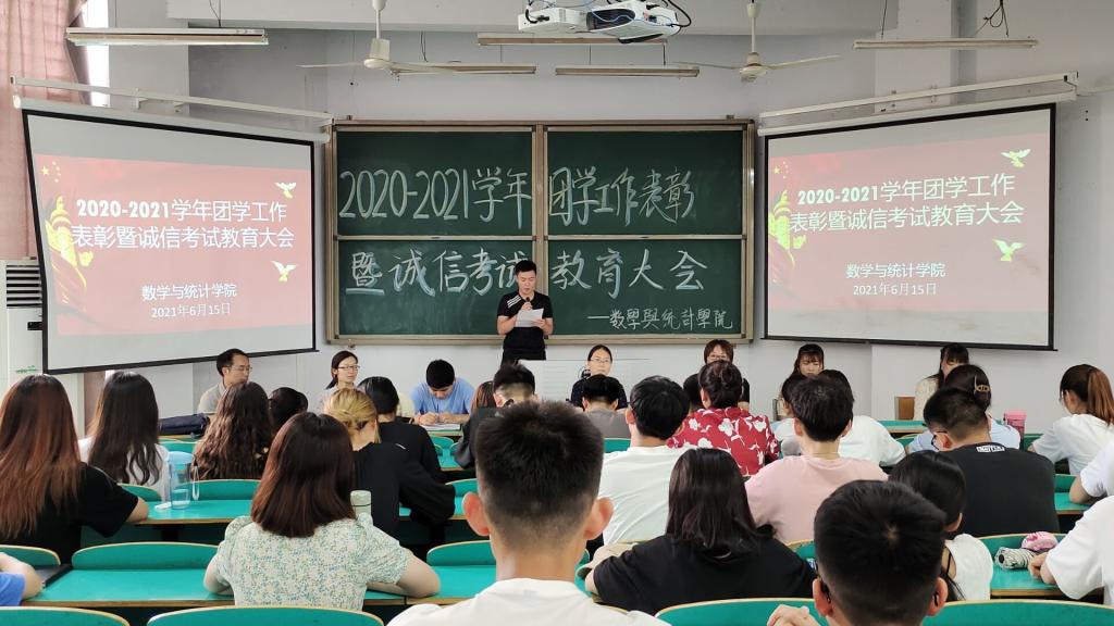 6月15日中午,数学与统计学院2020-2021学年团学工作总结表彰会暨诚信考试教育大会在数计楼106教室举行,学院党总支副书记刘颖方、学工干事田媛、团总支书记孙美、全体辅导员和各班级团学干部参加了此次大会。会议由孙美主持。