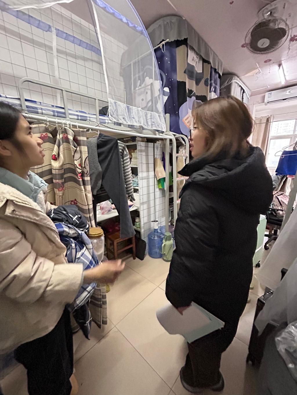 走访过程中,邓先强与辅导员们深入学生宿舍,与同学们亲切交谈,细致询问大家的假期生活收获及新学期规划。此外,辅导员们开展宿舍安全排查,仔细检查宿舍用电规范、卫生环境及违规物品存放等情况,向同学们讲解防火、防盗、防诈骗等安全提示,强化学生安全防范意识和自我管理能力。最后,老师们还叮嘱同学们尽快调整作息,从假期状态平稳切换到学习模式,合理规划新学期学业,积极投入新学期的学习生活中去。
