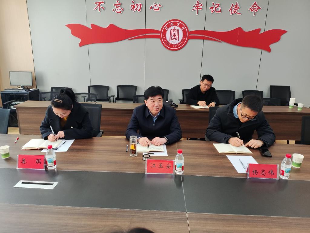 3月11日上午,校党委书记江玉安,纪委书记、校长助理杨高伟,党委办公室主任娄琪一行莅临生物与化学工程学院调研指导工作,学院党总支书记赵佳、教学副院长李晓严、学院班子成员参加调研并座谈。