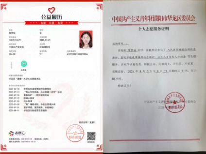 2020级美术学专升本陈梦倩,主动报名参加汝州市温泉镇“一站式”便民服务综合中心——温泉镇“群众之家”组织的志愿服务活动。在便民服务综合中心组织下她志愿服务参与到对出入人员健康码、行程码核实登记及体温检测等工作,随着疫情防控工作的深入开展,她还跟随老党员深入陈寨村防疫点一起值班,同其他志愿者一起将各种防控物资运送温泉镇。除此之外,她在镇团委办公室文化站实习的近2个月时间里,还负责图书室书籍整理和卫生打扫工作。她时刻弘扬践行志愿精神,用实际行动绽放青春本色。