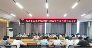 9月10日下午,马克思主义学院在社科楼109会议室采用线上线下相结合的方式举行2021—2022学年全体教职工大会。学院领导班子成员、返校教师参加了会议,其他教职工分别在线上观看会议直播。会议由党总支副书记主持。