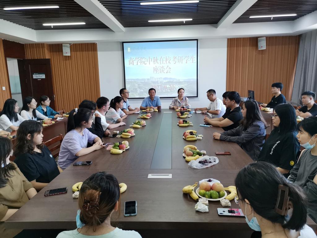 当日下午3:00,为加强与考研学子之间的交流,了解他们在校的生活学习情况,在综合楼715会议室召开了商学院2021年中秋节在校考研学生座谈会。教学副院长李毓、党总支书记胡秀云、学工干事黄伟和2018级各班考研留校学生代表参加交流会。会议由黄伟主持。