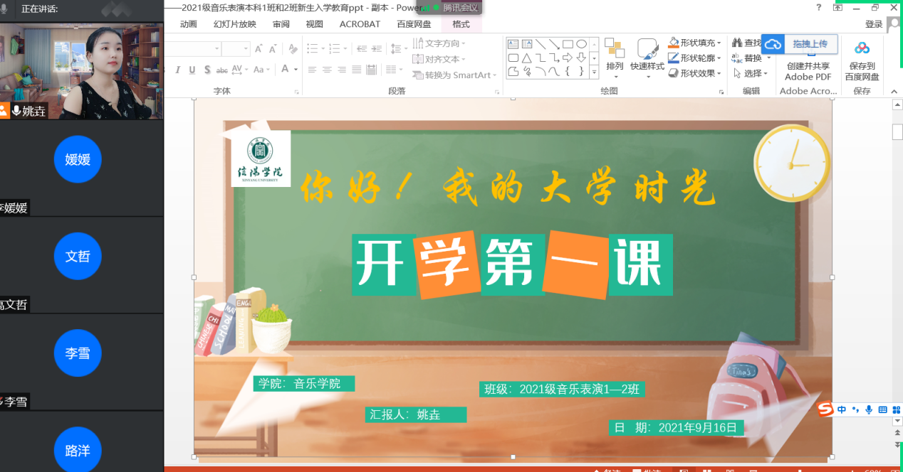 近日,为帮助大一新生更全面具体的了解学校基本信息和开学报到注意事项,2021年新进辅导员教师罗明亮、姚垚分别组织音乐学1-6班、音乐表演1-2班召开了大一新生线上主题班会。