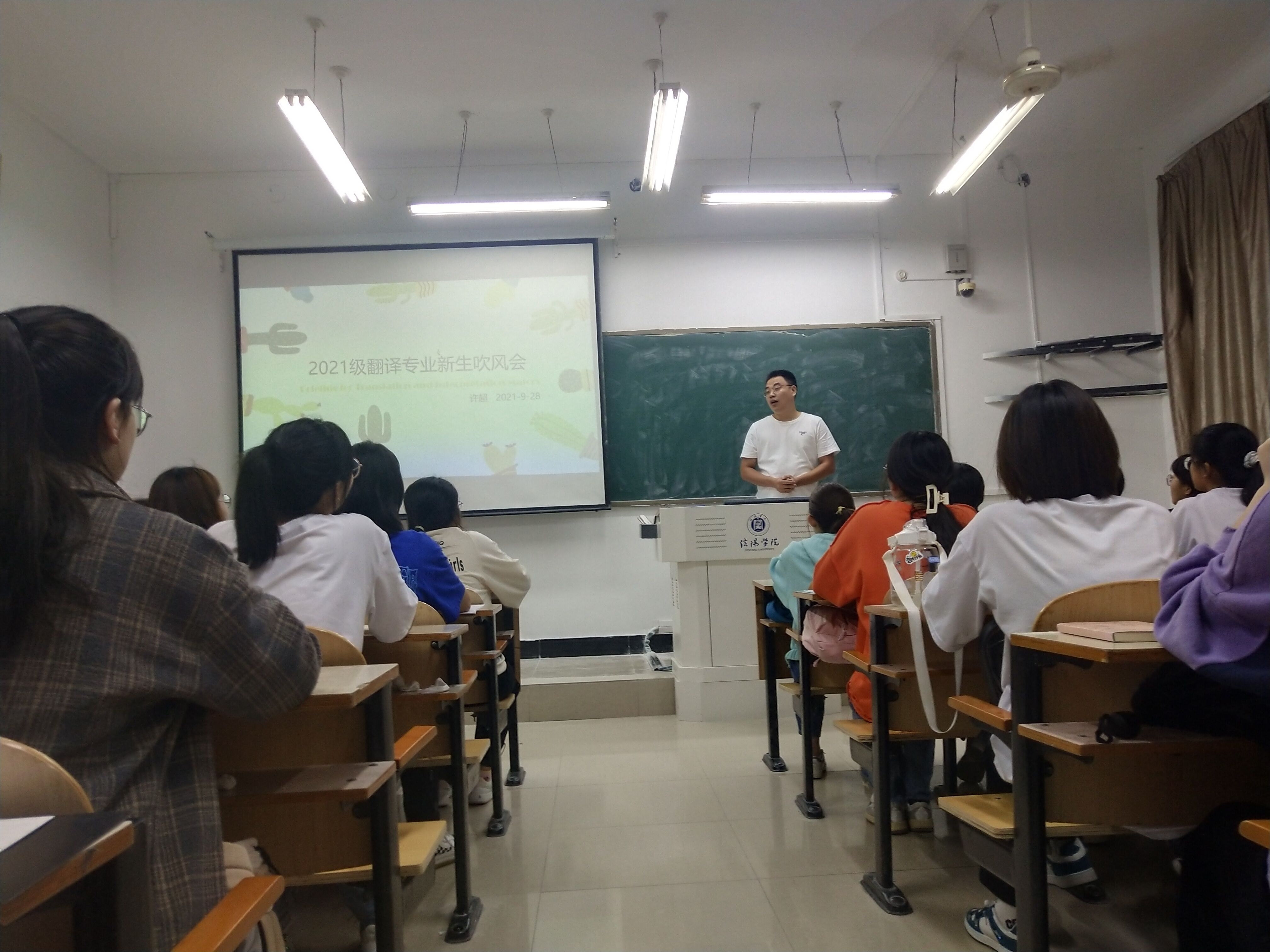 外国语学院高度重视2021级新生入学教育工作,为引导新生顺利完成角色转变,尽快融入新生活,9月28日晚上,外国语学院召开2021级新生入学教育。外国语学院院长罗德喜、党总支副书记程娇炎、学工干事何珊珊、教师代表、2021级新生辅导员和全体2021级全体新生参加了本次活动。