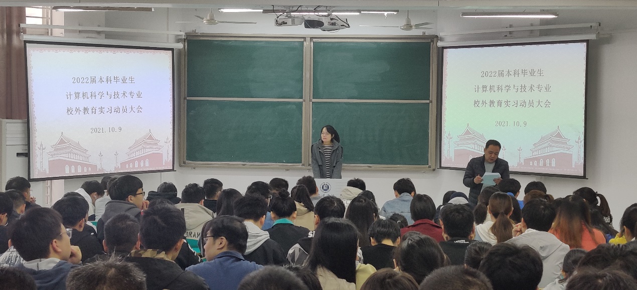 第一阶段为2022届计算机科学与技术专业毕业生教育实习动员大会,参加动员大会的有学工干事鄢杰、教育实习指导教师陈致超老师、张雪老师、辅导员王淼,2022届计算机科学与技术专业毕业生。