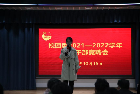 10月15日中午,校团委在综合楼传承馆举行了2021—2022学年学生干部竞聘大会。经过前期自愿报名、学院推荐、资格初审等程序,共有28名学生进入现场竞聘环节。校团委书记郑山峰出席此次竞选大会,并与团委老师徐媛、张翰文、张月共同担任评委。