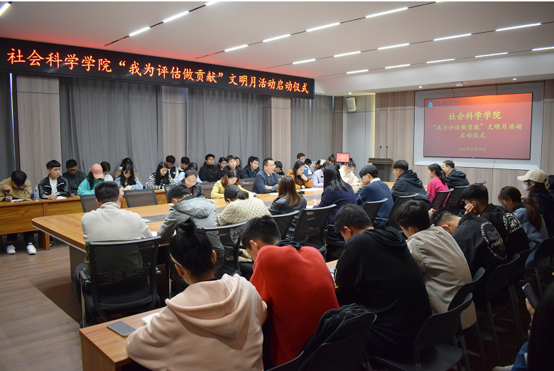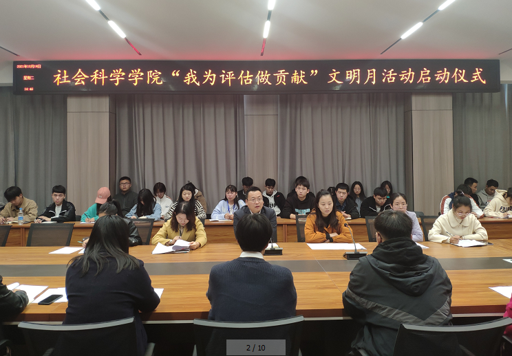 为扎实推进学校精神文明建设,营造迎评促建良好氛围,我院于2021年10月19日下午在社科楼109会议室举行“我为评估做贡献”文明月活动启动仪式。参加本次会议的有党总支副书记胡志国、教学干事王娜、行政负责人刘梦依、教研室主任、全体辅导员,以及各班班长、团支书、宿舍长代表。会议由团总支书记薛姗姗主持。