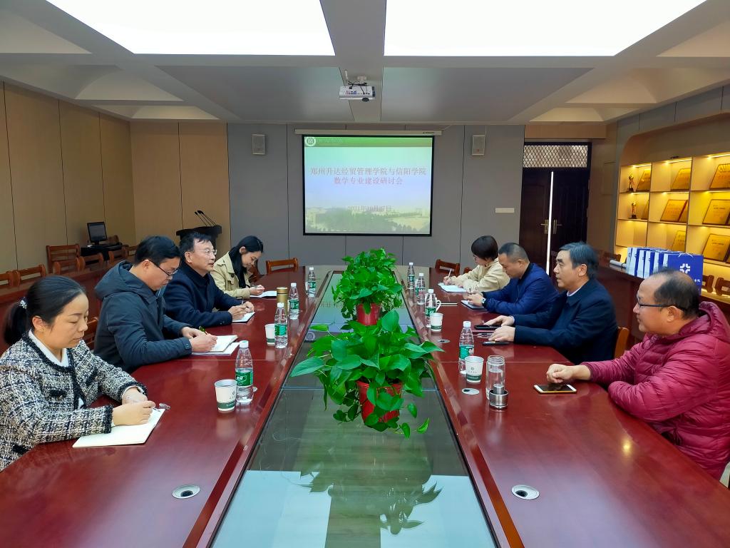 10月27日下午,郑州升达经贸管理学院基础部副主任焦争鸣、党总支书记张志银等一行到信阳学院考察交流,数学与统计学院院长俞迎达、党总支副书记刘颖方、教学副院长张聪等班子成员热情接待并在数计楼407会议室组织召开数学专业建设研讨会。