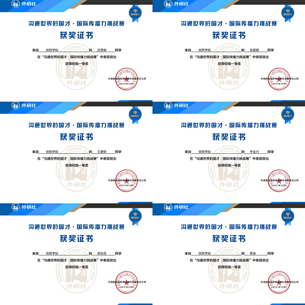 其中,2020级英语本科1班王梦瑶、2020级英语本科2班胡诗颖、田思楠;2020级英语本科3班罗小伟,2020级翻译本科1班宋贝贝等获得校级一等奖;董文静被评为优秀指导教师。