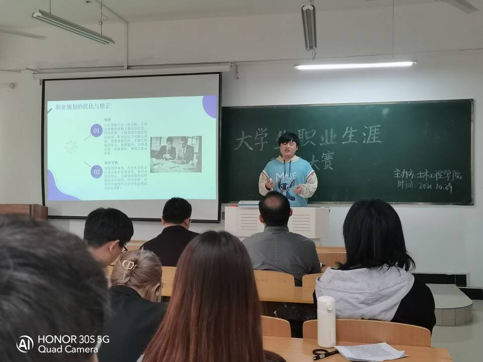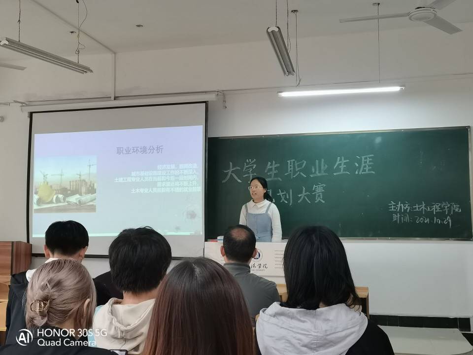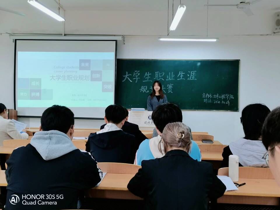 为进一步提升大学生职业生涯规划能力,引导广大学生树立正确的成才观、择业观,科学合理地规划大学学习与生活,提高就业技能与实践能力。10月29日上午,土木工程学院在理工楼307教室举办了大学生职业生涯规划大赛,学工干事徐超、团总支书记徐飞、辅导员蔡大海、杨柳、李静与部分学生会干部担任评委,部分学生代表参加了此次大赛。
