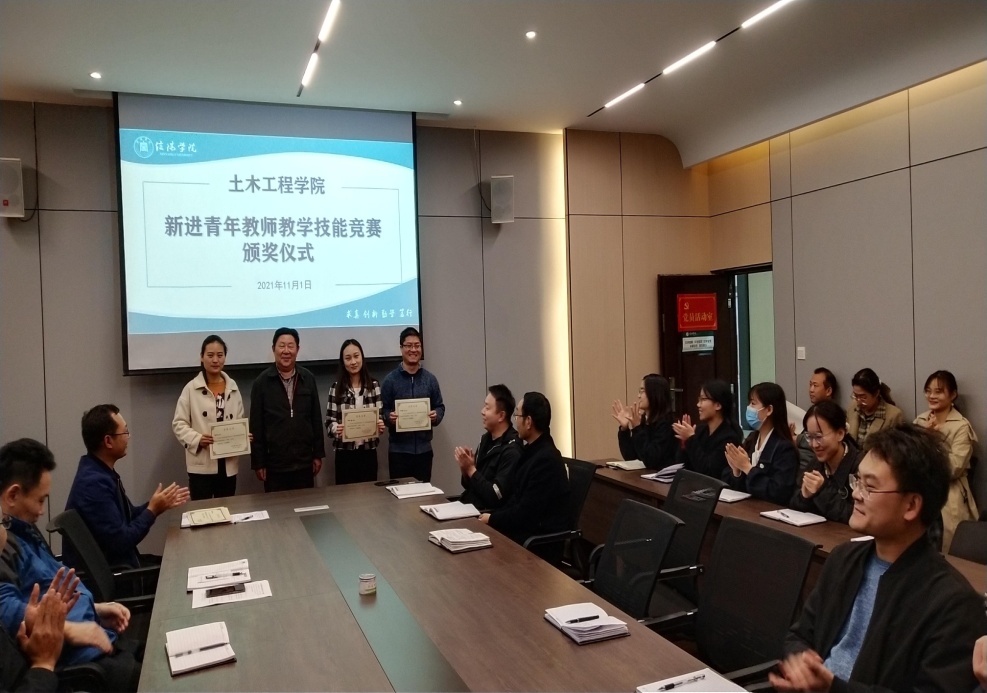 11月1日下午,土木工程学院在理工楼112会议室举行了“新进青年教师教学技能竞赛颁奖仪式”,学院全体教师参加了会议。颁奖会上名誉院长对本次青年教师技能竞赛给予了很大的肯定,并对青年教师提出了希望和要求,希望获奖的青年教师能够再接再厉,争取再创佳绩。