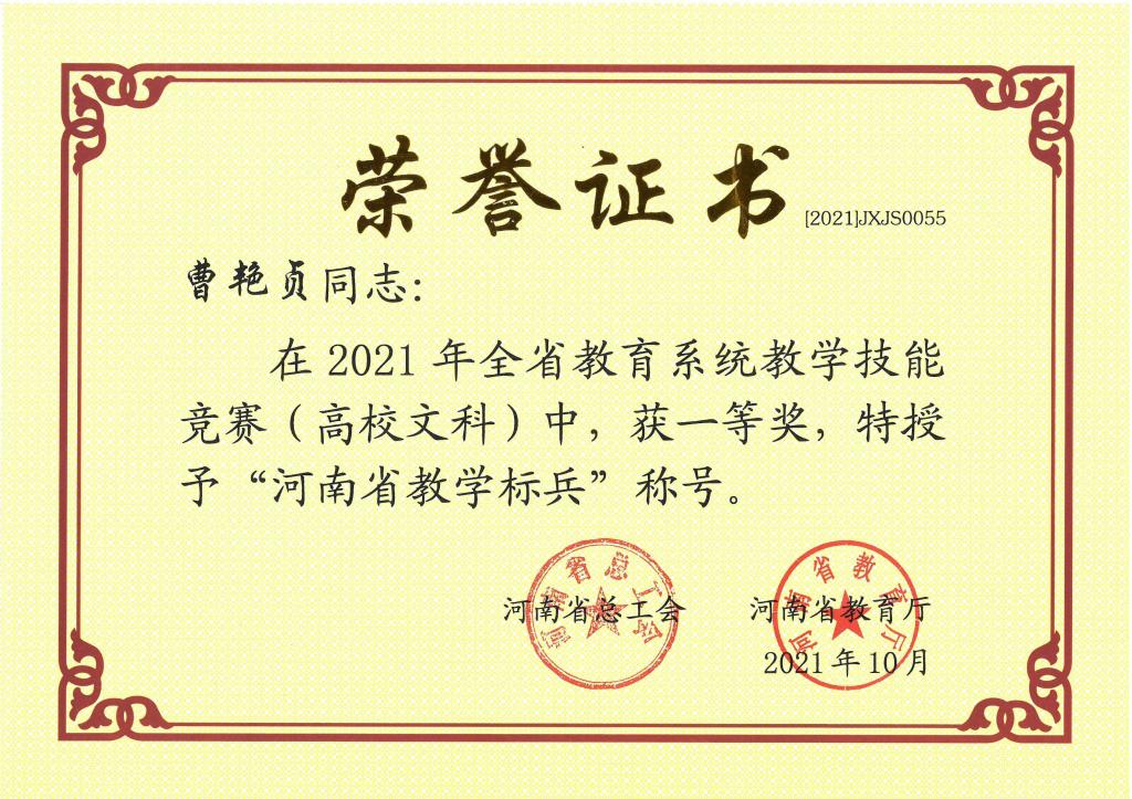 近日,从河南省总工会、河南省教育厅传来喜讯,在2021年河南省教育系统教学技能竞赛中,我院曹艳贞教师获得了一等奖并被授予“河南省教学标兵”荣誉称号。