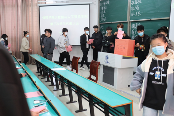 大会通过了《大数据与人工智能学院关于推选参加信阳学院第三次学生代表大会学生代表的选举办法》,提请的监票人和计票人获得了参会代表的同意。最后代表们依据无记名投票和直接差额选举的方式进行投票。经监票人和计票人统计,大会选举产生了代表学院参加信阳学院第三次学生代表大会的11名正式学生代表。