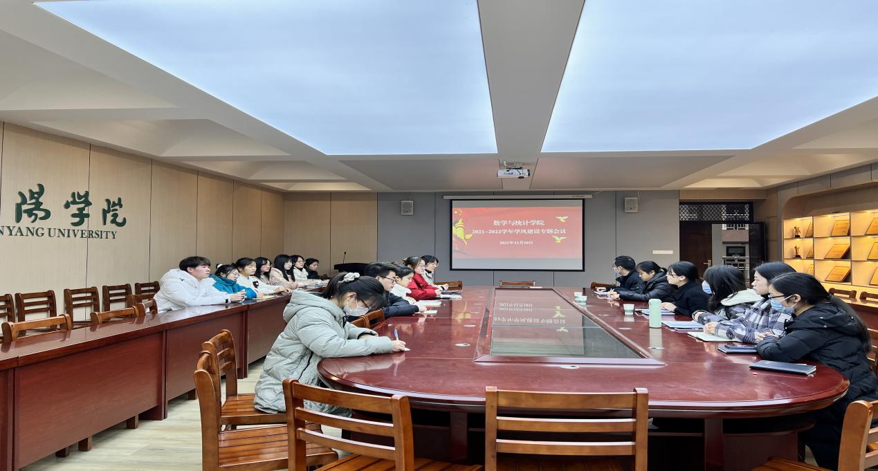 为进一步落实立德树人根本任务,充分调动学生学习的主动性和积极性,营造奋发向上、积极进取的学风氛围,12月10日,数学与统计学院在数计楼407会议室召开2021-2022学年第一学期学风建设专题会议。我院党总支副书记刘颖方、教务员吴琼茹、全体辅导员老师、各班学生代表参加了此次会议。