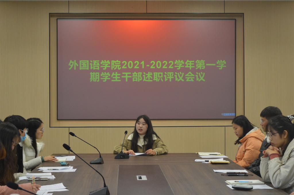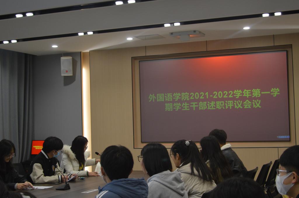 为进一步加强外国语学院团总支学生会干部队伍建设,增强学生会干部的自我教育、自我管理、自我服务、自我监督意识,提高学生会干部队伍的整体素质。外国语学院于12月10日在外语楼110会议室举行了2021-2022学年第一学期学生干部述职评议会议,对我院学生会主席团成员和各部门负责人进行全面且客观的综合考核,团总支书记吴章丽及学生会成员参与了此次会议。