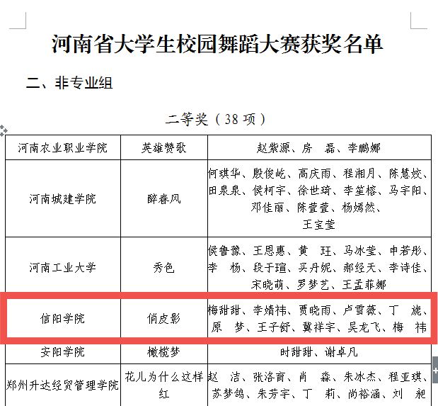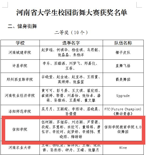 近日,信阳学院教育学院学子在河南省第十七届大学生网上科技文化艺术节校园舞蹈大赛中喜获佳绩。此次比赛是由中共河南省委宣传部、河南省教育厅、共青团河南省委、河南省文化和旅游厅、河南省学生联合会主办。信阳学院教育学院报送的舞蹈作品《俏皮影》在比赛中荣获非专业组二等奖,街舞作品《功夫》在校园街舞大赛中荣获健身街舞组二等奖。