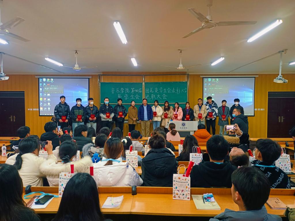 12月21日晚,音乐学院在艺术楼101教室召开了“音乐学院第四届团总支学生会表彰大会暨学生会述职大会”。音乐学院院长王凯歌,教学副院长杨辉,党总支副书记赵佳,学工秘书李平,辅导员李艳玲、樊丽、姚垚、梁二豪和全体学生会成员以及各班学生干部参加了本次会议。闫贵主持了会议。