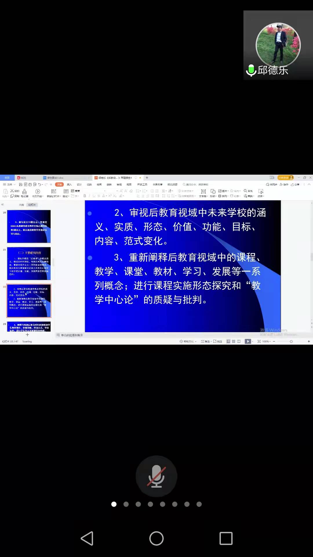 1月23日上午10点,由信阳学院教育学院特聘教授、学术带头人、硕士生导师邱德乐教授主持的河南省教育科学“十四五”规划2021年度重点课题项目“‘后教育时代’学校概念重建研究”举行线上开题报告会。河南大学教育学部博士生导师汪基德教授、沈阳师范大学杨艳蕾教授,赣南师范大学周先进教授、信阳师范学院韩文根教授作为专家受邀出席线上会议并予以指导。会议由教育学院教学副院长郑娇娇主持。