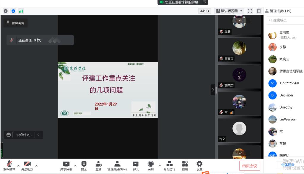 李静传达了王强校长讲话精神,结合评建工作重点关注问题,分别对合格评估指标体系、教学质量管控、产学研合作、青年教师教学水平提升、专业建设、实践实验教学、课程思政、毕业论文等八个方面向全体教师讲解了大家需要注意和关注的事项。