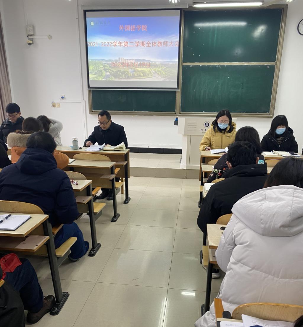 2月19日上午,外国语学院在外语楼202教室召开2021-2022学年第二学期全体教师大会。外国语学院院长罗德喜、党总支副书记程娇炎、教学副院长李静、学院干事及全体教师参加了会议。会议由程娇炎主持。