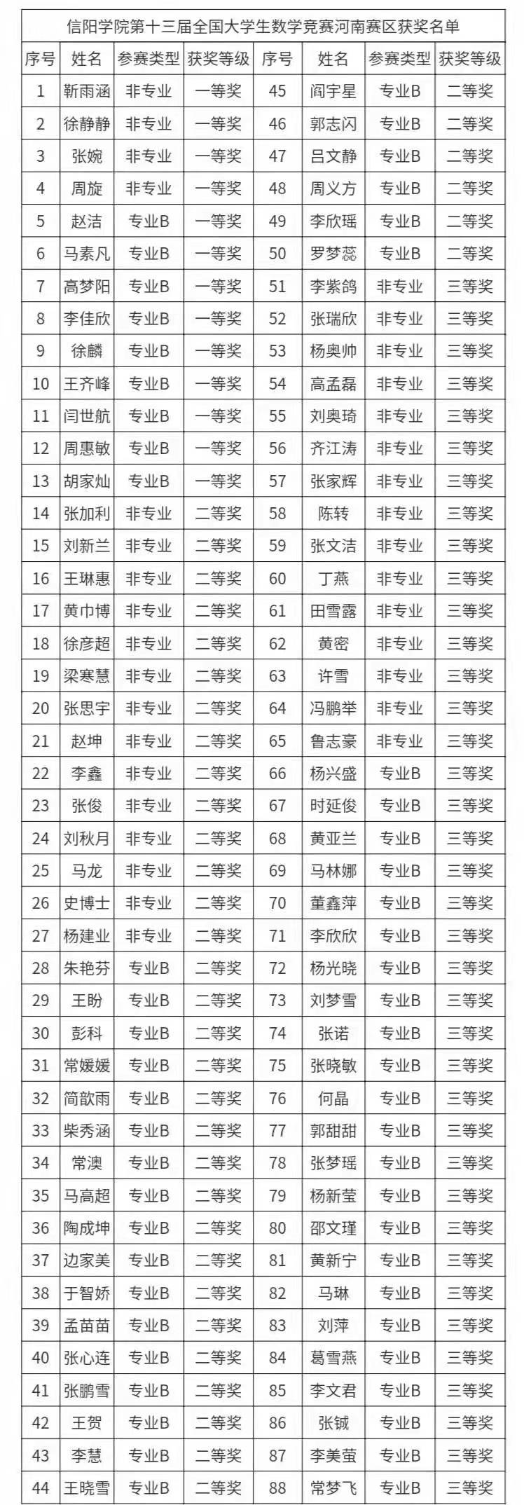 近日,第十三届全国大学生数学竞赛(河南赛区)竞赛结果揭晓,我校学子在本次竞赛中表现优异、成绩突出,共获得一等奖13项、二等奖37项、三等奖38项。与往年相比,获奖等次和数量均有较大提升。