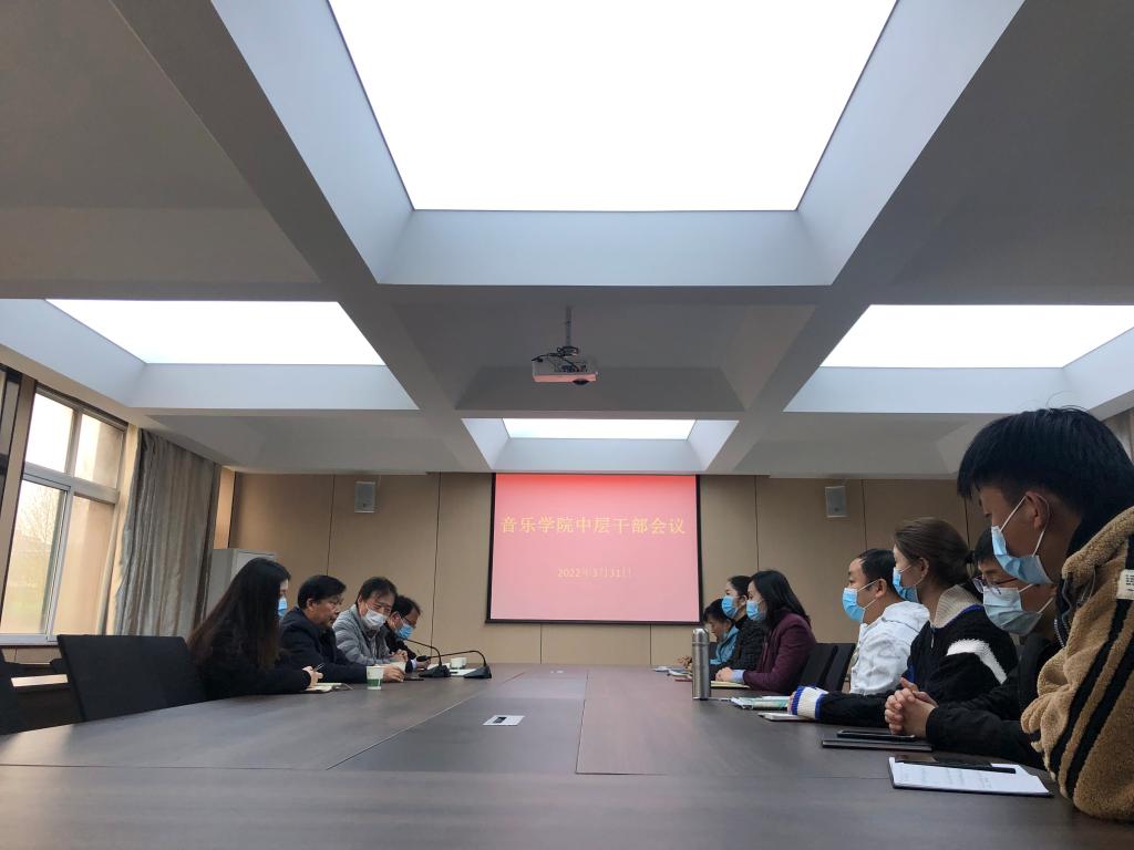 3月31日,音乐学院在艺术楼215会议室召开中层干部会议,宣布学院主要领导干部的任免决定。主管校领导施昌海,校党委组织部负责人杜倩,学院院长王凯歌、教学副院长杨辉等班子成员和教研室主任等中层干部参加了会议。会议由王凯歌主持。