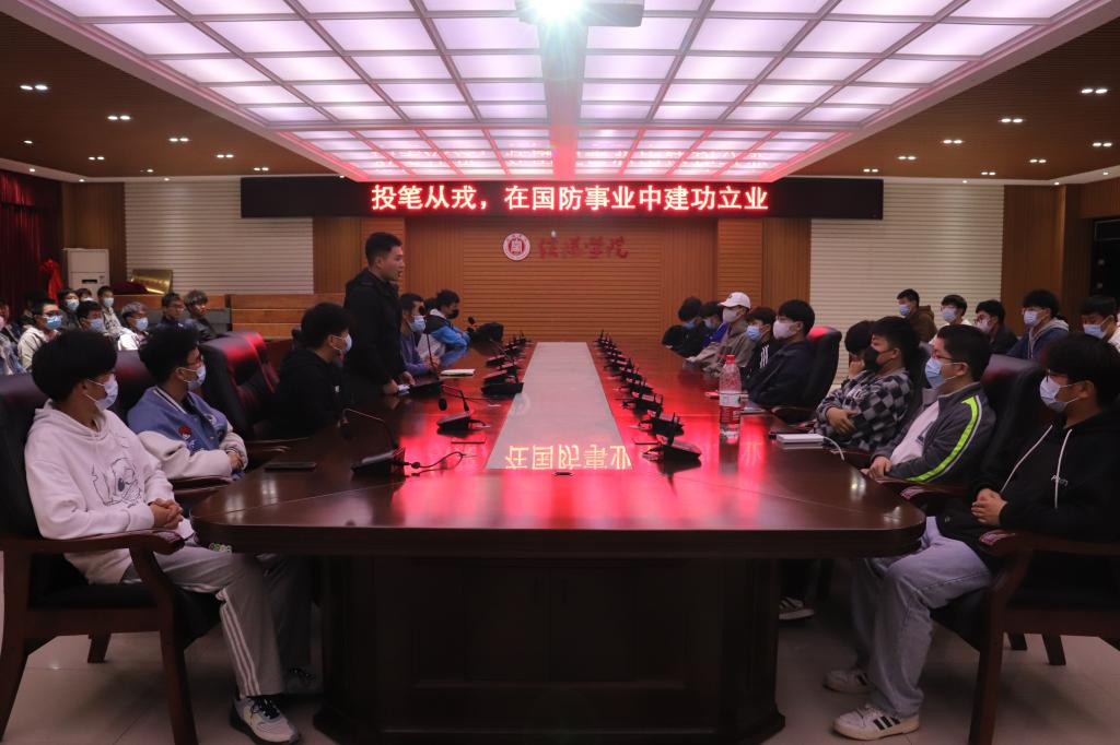 为进一步贯彻落实习近平强军思想,按照河南省军区、省教育厅、区武装部等上级单位有关要求,2022年3月29、30日晚7点文学院在人文楼208会议室分两次召开征兵入伍动员大会。此次会议由文学院征兵专员訾同超老师主持。退伍复学大学生代表徐进、姜志千及文学院2021级全体男生参加会议。